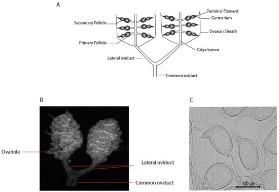 (A) A schematic diagram showing part of the mosquito reproductive system (after ref. []). (B) An image of Aedes aegypti ovaries. (C) Picture of Ae. aegypti ovarioles.