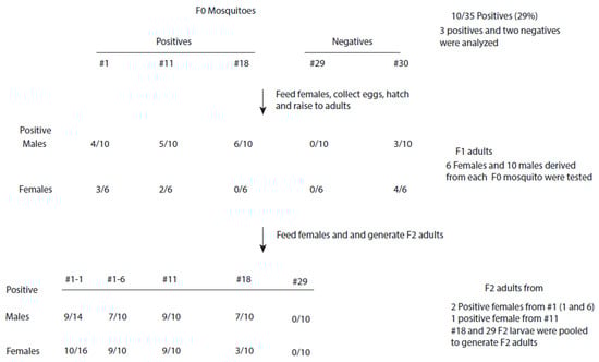 VT of CFAV in naturally infected mosquitoes. To monitor VT of CFAV, Ae. aegypti (Bangkok) mosquitoes from the colony were fed with a non-infectious blood meal. Engorged mosquitoes were separated into individual cups containing oviposition substrates. After five days, the eggs were collected, and the mosquitoes were dissected to determine the infection patterns of the midguts and ovaries (see Section 2). The carcasses were used to determine the infection status of the mosquitoes by RT-qPCR using virus-specific primers and probes. A total of 36 female mosquitoes were used (Figure 2). One mosquito died prematurely. Ten out of the remaining thirty-five mosquitoes (29%) were infected with CFAV, with CT values ranging from 30 to 32. From these 35 mosquitoes, 5 random mosquitoes (3 positives and 2 negatives) were used for further analysis. Adult F1 mosquitoes derived from each F0 mosquito were pooled and then fed with a non-infectious blood meal. From the pool, 10 males were tested for their infection status by RT-qPCR, and 6 engorged females were separated into individual cups containing oviposition substrates. After the mosquitoes had laid their eggs, they were dissected. The ovaries and midguts were fixed with formalin, and the carcasses were collected in mosquito diluent to determine the infection status of the mosquito (Figure 2). The carcasses were triturated and suspended in diluent for testing to determine the infection status.