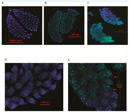 Infection patterns of the reproductive tissues were also analyzed by ISH using a virus-specific probe. Ovaries derived from CFAV-positive mosquitoes were analyzed. Both primary and secondary follicles, as well as germariums were infected, indicating TOT of CFAV in naturally infected mosquitoes. Most of the fluorescence was associated with the nurse cells. It is unclear at this stage how ovarioles were infected. In artificially infected mosquitoes, CFAV signals were present in the oviducts as for other dual-host orthoflavivirues [,,,,], but no CFAV signal was present in the oviducts or follicular epithelium in naturally infected mosquitoes (Figure 3). Either the oviducts are not involved during infection of the ovarioles, or the virus is cleared from the oviducts once the germariums are infected. Infection of tracheal cells is the likely precursor to the ovariole infection. More ovaries need to be tested in order to identify the precursor step with certainty. Other investigators also suggested tracheal cells as a possible conduit for the entry of rift valley fever virus and La Crosse virus into the ovaries [,,].