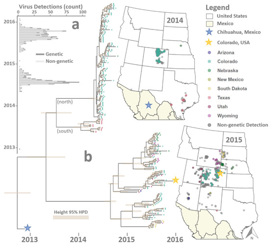 Phylogeographic analysis found a 2013 VSNJV isolate from Chihuahua, Mexico, to be the closest ancestral lineage to viruses sampled during the US 2014–15 outbreak cycle and rooted the time-resolved phylogeny to approximately November 2012 ± 10 weeks (Figure 2). During the intervening period between late 2012 and the first US detection on 23 May 2014 (index case, Texas), two distinct branching events occurred along the MCC phylogeny. The first bifurcation of interest occurred in approximately mid-2013. It produced two lineages: one line that would be ancestral to all US isolates sampled in 2014 and a second lineage that was a precursor to the 2015 outbreaks. The second branching event of note occurred between late 2013 and March 2014 and geographically divided what would become the 2014 line into geographically distinct “south” and “north” groups. The south group included the 2014 index case at the Texas–Mexico Border (May 23, Kinney County), whereas the north group was linked to outbreaks in Colorado [75].
