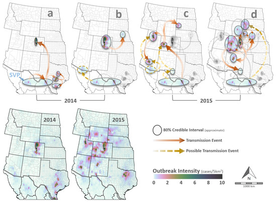 VS phylogeography. Maps summarize results from virus phylogeographic analysis and disease intensity modeling. The top row maps spatiotemporal relationships among genomes sampled from 2013 to 30 June 2014 (Panel (a)), the period of 1 July–31 December 2014 (Panel (b)), 1 January–30 June 2015 (Panel (c)), and 1 July–31 December 2015 (Panel (d)). Circular shapes overlaid in the top row approximate the location uncertainty (80% credible intervals), with arrows signifying potential dispersal events between locations. SVP stands for “Southern Virus Pool” and highlights the location uncertainty along the US–Mexico border. Red–brown arrows represent dispersal events estimated directly by the phylogeographic analysis, whereas gold–yellow arrows signify potential transmission events inferred from transmission models (Figure 6) and descriptive epidemiology. The bottom row panels display the estimated outbreak intensity (cases/5 km2) for 2014 (left) and 2015 (right) and are color-coded according to the legend at the bottom right.