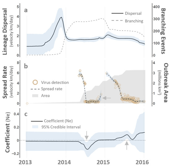 Virus lineage dispersal and virus population dynamics. The figure summarizes the lineage dispersal rates relative to phylogenetic branching (Panel (a)), the geographic spread rate among documented VS cases (Panel (b)), and the influence of the virus’s effective population size (Ne) on outbreak intensity (Panel (c)) as functions of time (horizontal axis at the bottom). Panel (a) illustrates increased phylogenetic branching (dashed line) immediately following virus introduction (smooth line, maximum). Panel (b) shows peak VS spread rates (dashed line, approximately 6 km/h) at the onset of the 2014 and 2015 seasons and relative to the total geographic area affected by disease (gray shading). In Panel (b), the arrow emphasizes an uptick in the spread rate in late 2014. Panel (c) displays the time-varying coefficient (smooth line) for the relationship between Ne and the outbreak intensity. In Panel (c), the arrows highlight the 95% credible interval departures from the average outbreak intensity (scaled to zero, horizontal line), indicating periods of statistical importance. Raw Ne estimates from phylodynamic analysis are given in Figure 5. See the main text for a detailed description.
