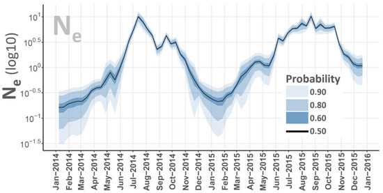 The effective population size (Ne) denotes the theoretical number of viruses in an idealized pool that would yield the same genetic variation and evolutionary patterns observed during the 2014–15 VS outbreak. Being tightly linked to pathogen diversity, the host population size, and the host infection number, Ne provides valuable insights into VSNJV transmission dynamics [47,48]. A higher Ne implies an expanded VSNJV pool, thereby indicating more host infections contributing to disease transmission. As estimated from the 2014–15 VSNJV genomes, Ne was positively correlated to VS incidence and displayed a temporal trend characteristic of an epidemic curve (Figure 5). That is, rather than indicative of an endemic steady-state equilibrium with values that fluctuate or cycle around a baseline number, Ne sharply increased in early 2014, peaked during the summer, and then abruptly declined by winter to form an “inter-epidemic trough” [92,94,95]. Following the winter bottleneck, the 2014 pattern mostly repeated in 2015, but summer Ne levels showed slightly more of a plateau that extended from early June through October 2015.