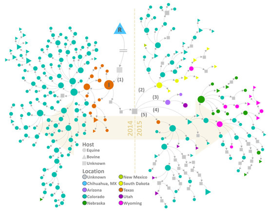 The phylogeographic (Figure 3a,b) and transmission network (Figure 6) analyses concurred that by mid-2014, VSNJV had spread from Texas to Colorado. Texas VS incidence then decreased sharply during the late summer of 2014, but cases continued in Colorado through November, ultimately seeding a Nebraska outbreak in early November 2014. Interestingly, the next VS cases to be documented occurred in mid-December 2014 and early February 2015 within the Mexico-bordering county of Santa Cruz, Arizona (confirmed by APHIS [75] on 6 January 2015). Genetic samples were not collected from either case; therefore, sequences were unavailable for phylogenetic analysis. However, transmission network analysis did infer the occurrence of a contemporaneous VSNJV host with an estimated December 2014 virus infection date.