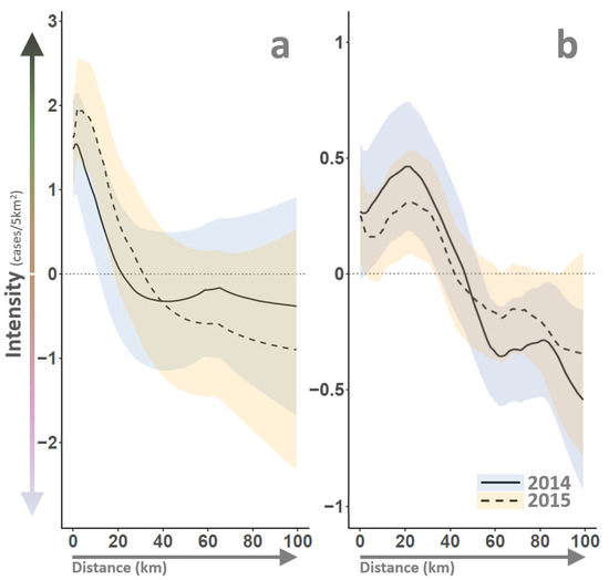 VS outbreak intensity was spatially and temporally heterogeneous throughout the 2014–15 epidemic (Figure 3bottom). After accounting for preferential and incomplete sampling, the model estimated VS intensity ranged from 0 (no cases) to 10 cases/5 km2, with the most intense outbreak rates identified for eastern Colorado during 2014 and 2015. Disease clusters or “hotspots” were also identified for south-central Texas in 2014 and north-central Utah, east Texas, and central Arizona in 2015. In epidemiology, an outbreak cluster refers to an unusually high number of related disease cases within a specific geographic area or time frame; such localized concentrations may indicate increased transmission rates or a common origin or exposure source [7]. Spatiotemporal modeling indicated that VS outbreaks clustered (see , Section 2.5) at a distance of approximately 10 km (Figure 7a), meaning that elevated case intensity was observed within a 10 km radius of an identified VS case, but VS risk quickly decreased beyond this distance threshold. The 10 km threshold estimated in this study is consistent with minimum quarantine and control area recommendations for foot-and-mouth disease [105,106] and emergency responses for other foreign animal diseases [107].
