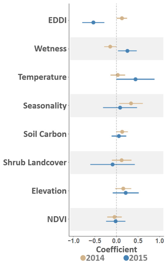 Estimated coefficients. Figure compares associations between VS outbreak intensity (cases/km2) and several environmental variables. Evaluated variables as listed on the vertical axis included drought conditions (EDDI), a topographical Wetness index, average minimum Temperature, a Seasonality index quantifying seasonal temperature variation, Soil Carbon, the proportion of Shrub Landcover within 5 km2, Elevation, and a Normalized Difference Vegetation Index (NDVI). Note that even after accounting for spatial correlation, temporal correlation, and preferential sampling biases, VS associations to drought conditions and environmental moisture varied between the 2014 and 2015 outbreak years. The contrasting relationships for these water-based influences may be suggestive of arthropod host switching, weather limitations, pathogen evolution, or other epidemiological factors contributing to incursion and expansion dynamics in the VS disease system.