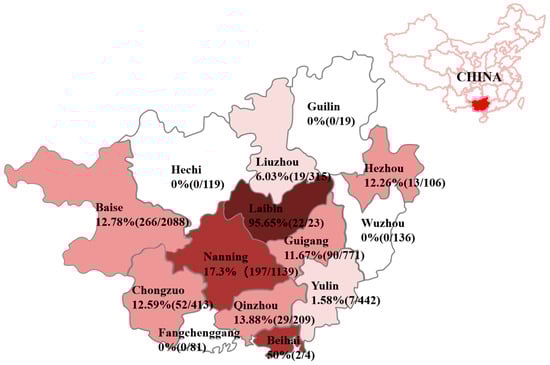 PEDV distribution in different regions of Guangxi province. Color depths are marked according to the positivity rate of each region.