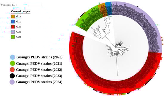 Since 2010, PEDV has caused significant economic losses to the pig industry worldwide. It is challenging to prevent and control due to the strong virulence and high mutation rate of circulating G2 genotype strains [31]. At present, PEDV has strong transmission characteristics. Furthermore, the classical strain CV777 vaccine used in clinical practice is not fully effective against variant PEDV strains circulating in China. Therefore, PEDV is still an important threat to the Chinese pig industry [32,33]. Of the 5859 diarrhea samples collected in Guangxi province from January 2020 to March 2024, 697 (11.90%) samples tested positive for PEDV, which differed from the 53.94% positivity rate reported in clinical samples collected in Guangxi province between 2017 and 2022 [20]. This difference might be attributed to the wide use of attenuated and/or inactivated PEDV vaccines and the implementation of strict biosecurity measures. In recent years, PEDV vaccines have been continuously improved to achieve better immune effects. They have been widely used in pig farms to increase pig herds’ overall immunity [10,34,35]. In addition, the outbreak of African swine fever (ASF) in 2018 in China led to more comprehensive biosafety systems and stricter biosecurity measures on pig farms, which greatly reduced the spread of pathogens between pig herds [36,37,38]. In this study, the positivity rates of clinical samples were 9.76%, 4.62%, 13.88%, 15.54%, and 4.95% from 2020 to 2024, respectively. These results indicate that the PEDV positivity rate in Guangxi province has decreased significantly in recent years. However, PEDV still maintains a certain infection rate requiring continuous prevention and control.