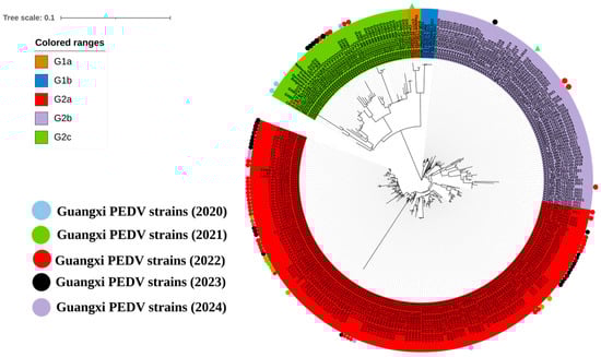 To further analyze the genetic evolution of the PEDV S1 gene in Guangxi province, 182 S1 gene sequences from Guangxi province were downloaded from the NCBI GenBank. The earliest sequence can be traced back to 2011 (Accession No. JQ979288). Based on the genetic evolutionary tree of the S1 gene (Figure 3), representative sequences were selected from different subgroups to reconstruct the genetic evolution tree of the PEDV S1 gene in Guangxi province. The results revealed that the 182 PEDV S1 gene sequences from Guangxi province from 2011 to 2024 and the 92 S1 gene sequences obtained in this study were mainly distributed in the G2 genotype, with 161 strains in the G2a subgroup, 71 strains in the G2b subgroup, 40 strains in the G2c subgroup, and only 2 strains distributed in the G1b subgroup (Figure 3, Table 4).