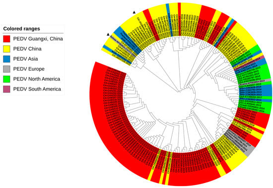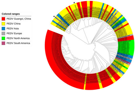- Bai, J.; Du, C.; Lu, Y.; Wang, R.; Su, X.; Yu, K.; Qin, Q.; Chen, Y.; Wei, Z.; Huang, W.; et al. Phylogenetic and spatiotemporal analyses of porcine epidemic diarrhea virus in Guangxi, China during 2017–2022. Animals 2023, 13, 1215. [Google Scholar] [CrossRef]