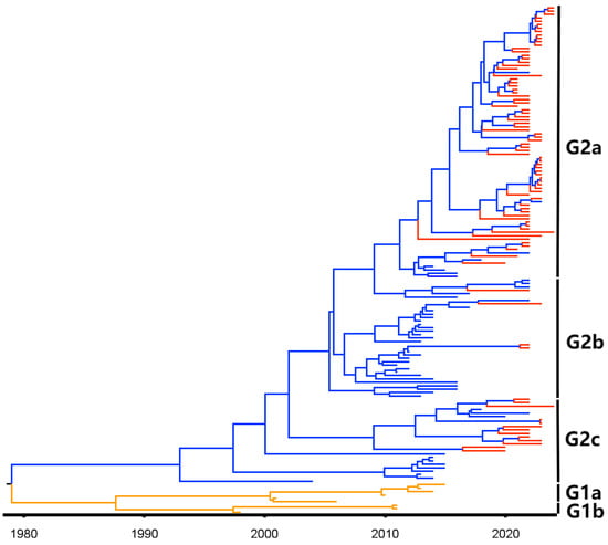 The maximum clade credibility (MCC) tree based on PEDV S1 gene nucleotide sequences. The G1 and G2 genotypes are labeled orange and blue, respectively. The obtained sequences from Guangxi province are labeled in red.