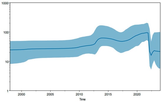 A Bayesian skyline of PEDV S1 gene sequences in Guangxi province. The genetic diversity average is indicated by a dark blue line, and the 95% confidence interval is indicated by light blue shading.