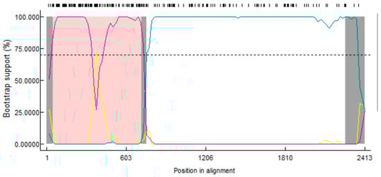- Kalyaanamoorthy, S.; Minh, B.Q.; Wong, T.K.F.; von Haeseler, A.; Jermiin, L.S. ModelFinder: Fast model selection for accurate phylogenetic estimates. Nat. Methods 2017, 14, 587–589. [Google Scholar] [CrossRef] [PubMed]