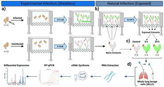 Visual presentation of our experimental model system to examine early gene expression during lung MDV infection. PC and WL chickens were experimentally infected with cell-associated MDV and housed separately. After 2 weeks, experimentally infected chickens began to shed the virus and were termed “shedders”. Two groups of naïve mixed chicken breeds (n = 8/breed) were exposed to the shedders. One group to PC Shedders (×PC) and the other to WL Shedders (×WL) to initiate infection through the natural route. WLLC samples were collected and used in RT-qPCR assays. Figure generated with Biorender.com (accessed on 10 June 2024).