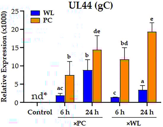 The relative mRNA expression of MDV UL44 (gC) in the MD-resistant (WL) and MD-susceptible (PC) chicken lines exposed to MDV-infected shedders (×PC and ×WL) compared with uninfected control (nd* = not detected). Data are presented as mean ± SD. Statistical significance was calculated using Multivariate ANOVA with factors chicken line (B), infection (I), and time (T), followed by Tukey’s post hoc test. Groups with different superscripts (a–e) are significantly different (p < 0.05) from each other. * = not detected.