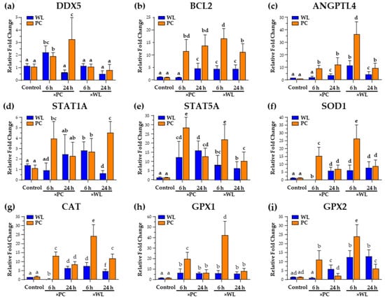 The relative mRNA expression of DDX5 (a), BCL2 (b), ANGPLT4 (c), STAT1A (d), STAT5A (e), SOD1 (f), CAT (g), GPX1 (h), and GPX2 (i) in the MD-resistant (WL) and MD-susceptible (PC) chicken lines exposed to MDV-infected shedders (×PC and ×WL) was compared to uninfected controls. Data are presented as mean ± SD. Statistical significance was calculated using Multivariate ANOVA with factors chicken line (B), infection (I), and time (T), followed by Tukey’s post hoc test. For specific genes, groups with different superscripts (a–e) are significantly different (p < 0.05) to each other.