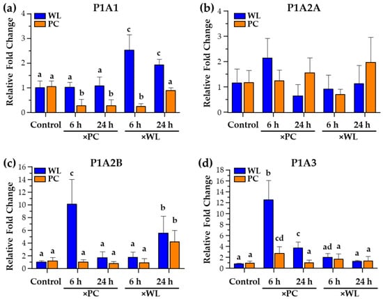 The relative mRNA expression of chicken P1 PR genes P1A1 (a), P1A2A (b), P1A2B (c), and P1A3 (d) in the MD-resistant (WL) and MD-susceptible (PC) chicken lines exposed to MDV-infected shedders (×PC and ×WL) was compared to uninfected controls. Data are presented as mean ± SD. Statistical significance was calculated using Multivariate ANOVA with factors chicken line (B), infection (I), and time (T), followed by Tukey’s post hoc test. For specific genes, groups with different superscripts (a–d) are significantly different (p < 0.05) to each other.