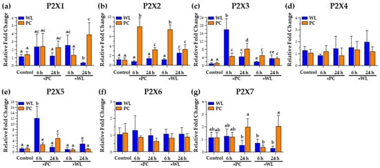 The relative mRNA expression of chicken P2X PR genes P2X1 (a), P2X2 (b), P2X3 (c), P2X4 (d), P2X5 (e), P2X6 (f), and P2X7 (g) in the MD-resistant (WL) and MD-susceptible (PC) chicken lines exposed to MDV-infected shedders (×PC and ×WL) was compared to uninfected controls. Data are presented as mean ± SD. Statistical significance was calculated using Multivariate ANOVA with factors chicken line (B), infection (I), and time (T), followed by Tukey’s post hoc test. For specific genes, groups with different superscripts (a–e) are significantly different (p < 0.05) to each other.