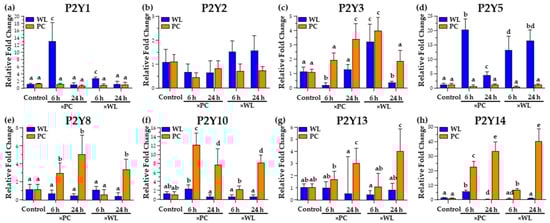P2Y receptors regulate immune cell functions, including phagocytosis and pathogen killing [139]. Some P2Y receptors are potential therapeutic candidates against viral infections, including herpes viruses [15,114]. In the current study, P2Y1 (Figure 6a) showed significantly higher expression at 6 h in WL birds, indicating its role in immunoregulation and response varies with viral load. P2Y2 (Figure 6b) showed no change, reflecting tissue specificity supported by the higher hepatic expression in our previous study [9]. P2Y3 (Figure 6c) responses suggest its importance in viral infection and replication by increasing infected cell survival. Higher P2Y5 (Figure 6d) expression in WL birds suggests a protective role against MDV, whereas significant increases in P2Y8, P2Y10, P2Y13, and P2Y14 (Figure 6e–h) expression in PC birds, supported by previous data [9], highlight their importance in MDV pathogenesis.
