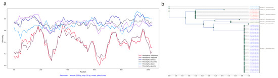 Employing SimPlot++, we conducted a sliding window analysis to unveil patterns of sequence similarity. Our input data comprised multiple sequence alignments of ORF1ab and spike amino acid sequences (the same alignment files used in Section 2.3). These sequences underwent filtration through cophylogeny analysis and were subsequently grouped based on their host associations. Additionally, the multiple sequence alignment of the cytb gene was leveraged for analyzing the similarity of bat hosts. Among these similarity analyses, amino acid alignments were evaluated using the Kimura model, while the Jukes–Cantor model was applied to nucleotide sequence analysis. The Jukes–Cantor model assumes uniform substitution rates and a base composition for nucleotide sequences, suitable for closely related sequences and straightforward genetic distance calculations. In contrast, the Kimura model adjusts substitution rates based on amino acid chemical properties, providing a nuanced approach that considers protein structure and evolutionary dynamics, offering a realistic view of protein evolution [48].