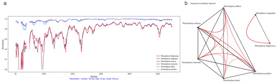 Initially, we conducted a comparison of cytochrome b (cytb) gene similarity among the seven bat hosts using Rhinolophus affinis as a reference. Among these hosts, Miniopterus fuliginosus and Miniopterus magnate exhibited the highest similarity at 94%, while sharing only 78–80% similarity with other species. The average similarity among the Rhinolophus genus is 89.10%, ranging from 87% to 92% (see Figure 2a).