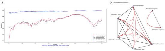 Dynamic sequence similarity patterns of ORF1ab amino acid sequences: (a) SimPlot sliding window analysis between coronaviruses from Rhinolophus affinis and six other bat species; and (b) sequence similarity network with global similarity threshold of 75%.
