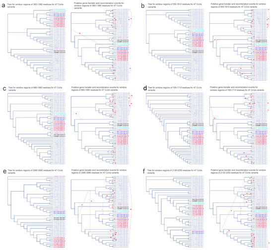Trees generated from amino acid fragments, for which all the –recombination tests yielded significant outcomes (≤0.05), were used as the gene trees. The rooted genome tree encompassing the 47 CoV viruses served as the foundational species tree. Each tree constructed from significant recombination regions was employed as input parameters for the HGT–Detection program. This tool facilitated the analysis of intergenic recombination events [51]. Certain transfers could potentially be attributed to the paradigm of parallel evolution, wherein species sharing akin environments experience similar mutations and develop corresponding traits.