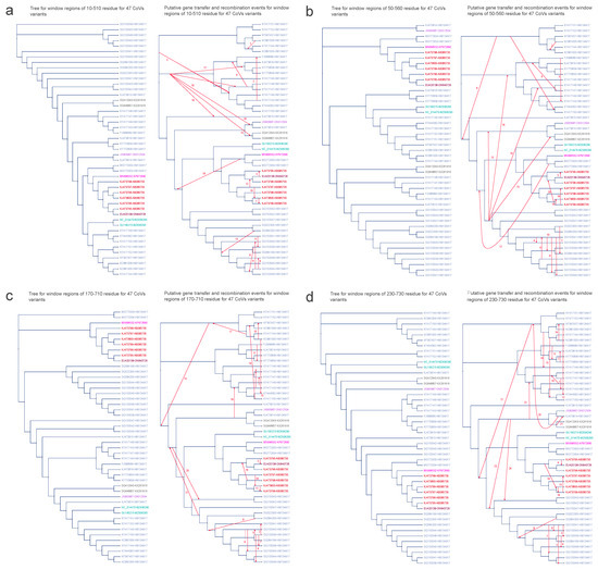Similar to the observations in ORF1ab, the majority of instances of partial HGT events within the spike protein were identified among virus variants originating from the same host (see Figure 8). Consistent with the findings of ORF1ab, HGT between the variant from Miniopterus magnater (EU420138–ON640726) and the variant from Miniopterus fuliginosus (KJ473795–AB085735) were detected across all four regions of spike: (1) 10–510, (2) 50–560, (3) 170–710, and (4) 230–730 (see Figure 8a–d). Regarding HGT involving variants from Rhinolophus macrotis (KX261916), the identified recombination partner in spike differed from that in the ORF1ab results. Within the region 230–730 (see Figure 8d), instead of JX993987–ON012504 (a variant from Rhinolophus pusillus), it was KJ473814–HM134917 (a variant from Rhinolophus sinicus) that exhibited recombination with KX261916. This outcome might arise from the similarity between KJ473814–HM134917 and JX993987–ON012504, a similarity underscored by their shared placement within the same branch on the phylogenetic tree. Similarly, within the region 170–710 (see Figure 8c), a substitution occurred in the HGT involving variants from Rhinolophus sinicus (HM134917), where KJ473814–HM134917 replaced JX993987–ON012504 as the recombination partner (see Supplementary Tables S2 and S3 for further details).