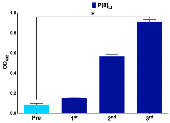 Monitoring of antibody production in group immunized with VP8* P[8]LI after each immunization. Measurements at baseline (day of first immunization), 3 weeks (day 21), 6 weeks (day 42), and 9 weeks (day 63) of antibody production (measured as optical density at 492 nm by enzyme-linked immunosorbent assay—ELISA) in serum (1/100 dilution) against each VP8* P[8]LI. Bars show the mean and error bars show the standard deviation. Asterisks represent statistically significant difference between columns 1 and 4.