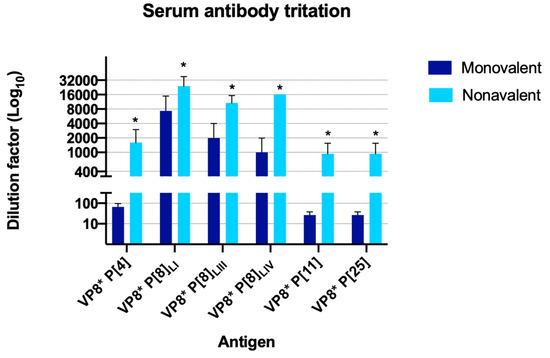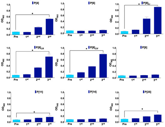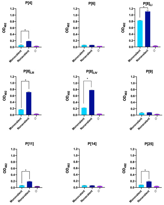 Figure 1 represents antibody production in mice immunized with the monovalent vaccine, primarily showing antibody production against the vaccine protein VP8*, P[8]LI. In the case of the nonavalent vaccine group, antibodies were produced against six proteins, showing statistically significant differences in antibody levels between the first and last serum samples in P[4], P[8]LI, P[8]LII, P[8]LIV, P[11], and P[25] (Figure 2). No antibodies were detected against P[6], P[9], and P[14]. Additionally, a new ELISA was conducted to assess significant differences in antibody production against each antigen between different groups (Figure 3). The results showed no significant differences in antibody production against the VP8*, P[6], P[9], and P[14]. However, the immunization was successful with all the other assayed VP8*s (P[4], P[8]LI, P[8]LIII, P[8]LIV, P[11], and P[25]). In all these cases, the differences in the signal of the group immunized with the nonavalent formulations was significatively higher than that of the group immunized with the monovalent formulation.