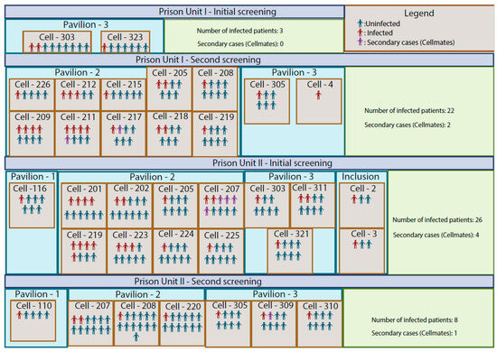 The testing strategy implemented in this study revealed a nuanced epidemiological profile of SARS-CoV-2 transmission within the prison population. Analysis of the data identified 59 primary (index) cases, which constituted 89.39% of the total confirmed infections. Additionally, through contact tracing efforts, an extra seven secondary cases were detected, representing 10.61% of the infections (Figure 1). This distinction between primary and secondary cases underscores the efficacy of contact tracing in identifying transmission chains within these settings. The study also delineated the temporal progression of the outbreak across the two prison units. Specifically, Prison Unit I witnessed a significant increase in cases, from 3 to 24, over an 88-day period between the initial and subsequent testing phases. Conversely, Prison Unit II experienced a reduction in cases, from 30 to 9, over a 39-day interval. Such temporal dynamics indicate the fluctuating nature of SARS-CoV-2 spread within these environments, impacted by various containment and mitigation strategies. A noteworthy observation from the second round of screenings was the considerable influx of new inmates, with a change of nearly 50% in the prison population—42.72% in Prison Unit I and 50.57% in Prison Unit II. This high turnover rate underscores the dynamic nature of prison populations and the potential for new introductions of the virus into the environment. Of the 220 prison cells, 33 recorded positive cases (Figure 1), illustrating the widespread nature of the virus within these facilities. The distribution of SARS-CoV-2 cases varied across different units, with Pavilion 2, the intake area, showing a higher frequency of new infections and an average of 8 people per prison cell (Figure 1).