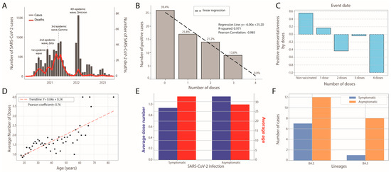 Epidemiological Dynamics of SARS-CoV-2 within Prison Units I and II in Mato Grosso do Sul. (A) Temporal distribution of daily SARS-CoV-2 cases and associated fatalities; (B) correlation between the number of positive cases and the number of vaccine doses administered among prisoners; (C) variation of the Positive Representativeness Index (PRI) with the number of doses; (D) correlation between number of doses and age of prisoners; (E) correlation between the average number of vaccine doses (in blue) received and the average age (in red), categorized by disease status categorized by host reaction to SARS-CoV-2 infection (symptomatic and asymptomatic); (F) correlation between the total number of SARS-CoV-2 cases per lineage (BA.2, BA.5), with cases colored based on clinical condition (symptomatic and asymptomatic infections).