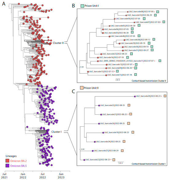 Phylogenetic Analysis of SARS-CoV-2 within Prison Units in Mato Grosso do Sul. (A) Maximum likelihood phylogenetic tree incorporating the 28 novel genome sequences generated in this study alongside 3036 reference sequences from the Omicron BA.2 and Omicron BA.5 SARS-CoV-2 variants. Colors indicate different lineages: Omicron BA.2 in red and Omicron BA.5 in purple (B,C). These panels depict the two distinct monophyletic clusters identified within Prison Units I and II, * respectively, highlighting clades suggestive of contact-based transmission.