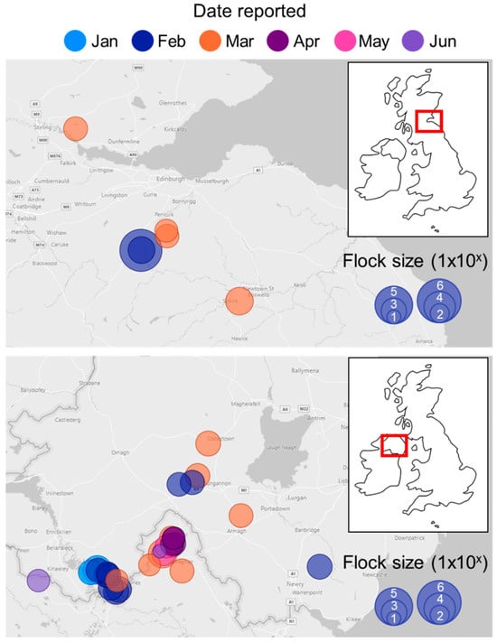 Timeline and location of infected premises across the Republic of Ireland, Northern Ireland, England, and Scotland. Location and flock size of infected premises across affected areas are shown, with the increasing number of premises illustrated at each site. The time of detections is coloured by month according to the key.