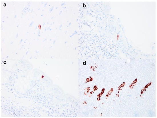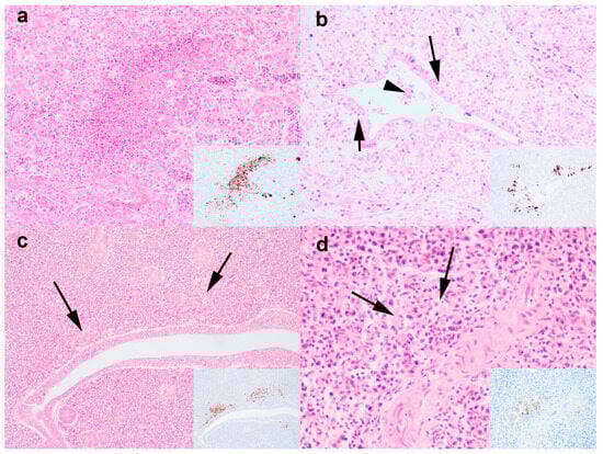 Necropsies conducted at APHA (n = 14) for Scottish and English cases revealed non-specific changes in the carcasses, including coelomitis (n = 4), oophoritis (n = 3), salpingitis (n = 3), visceral gout (n = 2), splenomegaly (n = 4), and renomegaly (n = 3). Viral IHC performed on the birds (n = 14) revealed the presence of viral antigens in the brain (n = 1/12), spleen (n = 6/13), kidney (n = 5/14), caecal tonsil (n = 1/8), nasal turbinate (n = 1/12), trachea (n = 1/13), lung (n = 1/13), oviduct (n = 2/6), and ovary (n = 1/9). Specifically, viral antigens were localised in the vascular endothelial cells of the brain and lung (Figure 2a,b; same bird); epithelial cells of the nasal turbinates, trachea (Figure 2c), renal tubules (Figure 2d), and caecal tonsil; and lymphoid cells in the spleen and caecal tonsil. Viral antigens were generally rare; however, in the kidney, a moderate amount of viral antigen was detected. In cases where viral antigens were detected, correlative viral IHC and histopathology analyses revealed pathology associated with AIV infection, including mild tubular epithelial degeneration (n = 1/5) or moderate-to-severe necrotising tubulointerstitial nephritis (n = 4/5; Figure 3a); mild suppurative salpingitis (n = 1/2; Figure 3b); mild lymphoid depletion in the caecal tonsil (n = 1/1; Figure 3c) and spleen (n = 2/6; Figure 3d); mild lymphocytic tracheitis (n = 1/1) and rhinitis (n = 1/1). Other background infection and lesions detected include tracheitis with intralesional intranuclear inclusion bodies (n = 1/13; infectious laryngotracheitis), intestinal nematodiasis (n = 1/13), and intestinal coccidiosis (n = 3/13). Other non-specific histopathological findings included visceral gout-associated myonecrosis (n = 1/12) and air capillary necrosis (n = 2/12), lymphocytic rhinitis (n = 1/11), and splenic lymphoid hyperplasia (n = 4/13).