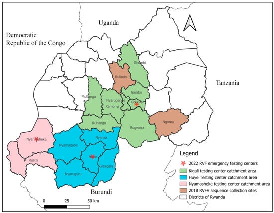 The livestock samples used in this study were obtained from the Rwanda Agriculture and Animal Resource Development Board (RAB), Central Veterinary Laboratory, located in Rubirizi, Kigali. A total of 37 archived and unscreened samples (9 sera and 28 whole blood samples) from the 2018 RVF outbreak were collected between 14 April and 17 July 2018 from six districts of the Eastern province and the Rulindo district of the Northern province. In addition, 157 archived RVFV-positive samples (as detected by RT-qPCR) were available from the 2022 RVF outbreak, and originated from three (Kigali, Huye, and Nyamasheke) of the six RVF emergency testing centers established by the Government of Rwanda as part of the response to the 2022 RVF outbreak. These centers were charged to systematically perform pre-slaughter RVFV screening by RT-qPCR of all animals arriving at slaughterhouses (both large and small) for meat production. The purpose of this screening was to prevent human infections that would be caused by handling infected animals and derived meat and other tissues. Each center processed the samples aggregated from different slaughterhouses operating in their assigned catchment area (Figure 1). At each slaughterhouse, animal blood samples were drawn from the jugular vein in 4 mL ethylenediaminetetraacetic acid (EDTA)-coated vacutainer tubes by trained field veterinary technicians wearing appropriate personal protective equipment (PPE). After collection, blood samples were placed in cooler boxes and transported to the testing centers.
