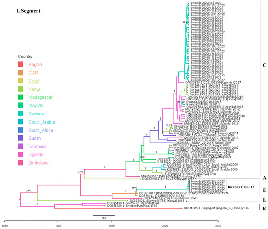 Bayesian molecular clock analysis of RVFV strains based on L segment. The time-scaled maximum clade credibility tree is depicted with branches colored according to country of origin of the viruses analyzed. The phylogenetic tree tips are labeled as accession, name, country, and year of collection of the specimens. RVFV Clone 13 sequences isolated in Rwanda are shown in the box. The letters indicate RVFV lineages. Posterior support values (HPD) are shown above each node (i.e., 1 = 100% support).