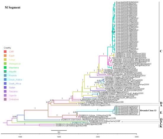 Bayesian molecular clock analysis of RVFV strains based on M segment. The time-scaled maximum clade credibility tree is shown with branches colored according to country of origin of the viruses analyzed. The phylogenetic tree tips are labeled as accession, name, country, and year of collection of the specimens. RVFV Clone 13 sequences isolated in Rwanda are shown in the box. The letters indicate RVFV lineages. Posterior support values (HPD) are shown above each node (i.e., 1 = 100% support).