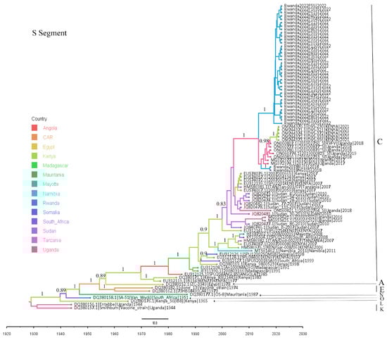 Bayesian molecular clock analysis of RVFV strains based on S segment. The time-scaled maximum clade credibility tree is presented with branches colored according to country of origin of the viruses analyzed. The phylogenetic tree tips are labeled as accession, name, country, and year of collection of the specimens. RVFV Clone 13 sequences isolated in Rwanda are shown in the box. The letters indicate RVFV lineages. Posterior support values (HPD) are shown above each node (i.e., 1 = 100% support).