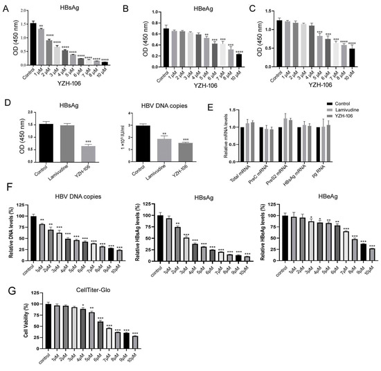 As shown in Figure 1D, treatment with 3 μM YZH-106 caused approximately 58% and 48% reductions in the levels of HBsAg and HBV-DNA in the cell supernatant (both p < 0.001). Lamivudine, as the positive control, could only reduce HBV-DNA in the cell supernatant by about 35% (p < 0.01). In contrast, no obvious changes in HBV mRNA levels were observed in the YZH-106-treated cells (Figure 1E), indicating that YZH-106 affected HBsAg levels not through the inhibition of HBV transcription, while the levels of HBsAg or HBV mRNA were hardly affected by lamivudine (Figure 1E). Furthermore, the HepG2-NTCP cells infected with HBV from CHB patients were treated with YZH-106, and then HBsAg, HBeAg, and HBV-DNA in the cell supernatant were detected. As shown in Figure 1F, YZH-106 induced a reduction in HBV DNA copies and HBsAg and HBeAg levels in a dose-dependent manner. More decrease in HBsAg than HBeAg was observed after treatment with YZH-106. The EC50s of YZH-106 on HBV-DNA, HBsAg, and HBeAg were around 4 μM, 3 μM, and 8 μM, respectively. To exclude the possibility that inhibition of HBV by YZH-106 was caused by the cellular cytotoxicity in the HepG2-NTCP cells, the cell viability was analyzed using the CellTiter-Glo assay. The results demonstrated that YZH-106 at concentrations of 4 μM or less could hardly influence cell viability (Figure 1G), indicating that YZH-106 exerted antiviral activity not mainly through cytotoxicity.