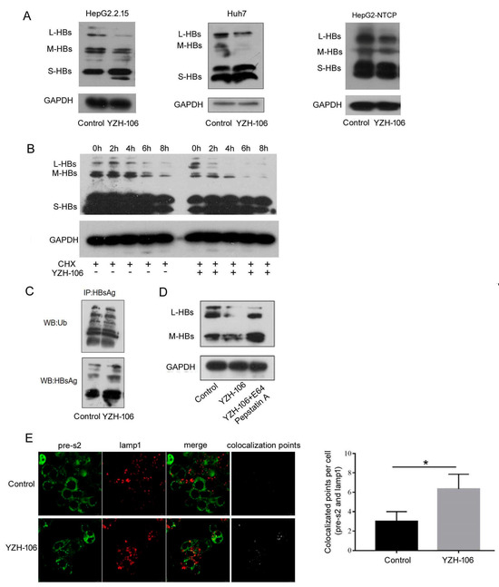 YZH-106 induced lysosomal degradation of L- and M-HBs proteins. (A) HepG2.2.1.5 and Huh-7 cells transfected with 1.3 copies of HBV or HepG2-NTCP cells infected with HBV were treated with 3 μM YZH-106 or DMSO as a control, respectively. At 24 h after treatment, L-HBs, M-HBs, and S-HBs protein levels were detected using Western blotting. (B) HepG2.2.1.5 cells in the presence of the translation inhibitor CHX were treated with 3 μM YZH-106 or DMSO as a control for the indicated times. Then L-, M-, and S-HBs protein levels were detected using Western blotting. (C) HepG2.2.1.5 cells were treated with 3 μM YZH-106 for 24 h and exposed to 20 µM MG132 for 6 h before lysis. HBs protein was immunoprecipitated and subjected to immunoblot with an antibody specific to ubiquitin. (D) HepG2.2.1.5 cells were treated with 3 μM YZH-106 alone for 24 h or together with E64d and Pepstatin A. L- and M-HBs proteins were analyzed using Western blotting. (E) Immunofluorescence staining was performed to analyze the co-localization of PreS2 (Green) and lamp1 (red) in YZH-106 treated HepG2.2.1.5 cells. The co-localization points were computed using Image J (https://imagej.net/ij/). Data are presented as the means ± SD from three independent experiments. * p < 0.05 compared to control. The experiments were performed twice with similar results.