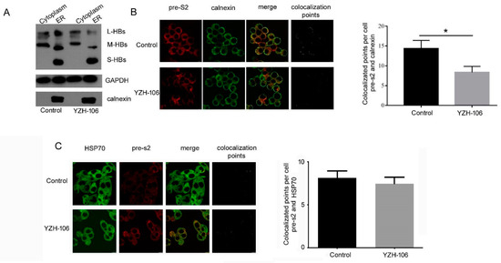 After HBs proteins are translated in cytoplasm, they quickly translocate to and accumulate in the ER and form agglomerates through covalent disulfide bridges with different cysteines in their S domain, which are then secreted from the cell as new infectious virions as well as noninfectious envelope particles [17]. We then investigated at which step YZH-106 may affect HBsAg secretion. The cytoplasmic and ER components in the HepG2.2.15 cells under YZH-106 treatment for 48 h were isolated, and the HBs proteins were examined using Western blot analysis. As demonstrated in Figure 3A, treatment with YZH-106 led to decreased L- and M-HBs but not S-HBs protein levels in the ER compared to the control, whereas there was almost no change in the L- and M-HBs protein levels in the cytoplasm upon treatment with YZH-106. The co-localization of PreS2 and the ER marker calnexin or the cytoplasm marker HSP70 was further evaluated using a fluorescence microscope. As shown in Figure 3B,C, co-localization of PreS2 and calnexin but not HSP70 significantly declined with YZH-106. Collectively, these data suggest that YZH-106 suppressed L and M-HBs protein entry into the ER.