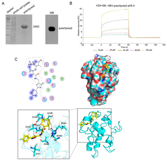 YZH-106 binds to PreS2 domain. (A) Expression and purification of His-tagged PreS1-PreS2 fusion protein in E. coli. The purified protein was subjected to SDS-PAGE and stained with Coomassie blue or immunoblotted with an anti-PreS2 Ab. (B) Interaction of YZH-106 and PreS1-PreS2 fusion protein was evaluated using a direct binding assay using the Biacore system. (C) YZH-106 docking model with PreS1-PreS2 fusion protein. Top left: the 2D binding mode of YZH-106 and PreS1-PreS2. Top right: the surface binding mode of YZH-106 and PreS1-PreS2. Bottom: the 3D binding mode of YZH-106 and PreS1-PreS2.YZH-106 and PreS1-PreS2 residues are colored in yellow and cyan, respectively. The residue Arg102 adjacent or within PreS2 forms a hydrogen bond with YZH-106. Additionally, residues His105 and Ser152 each engage in two H-Pi conjugation interactions with YZH-106. The interaction amino acids between YZH-106 and PreS1-PreS2 are shown as blue or red sticks, and non-carbon atoms are colored according to their chemical identity (C, cyan or yellow; O, red; N, blue; H, white).
