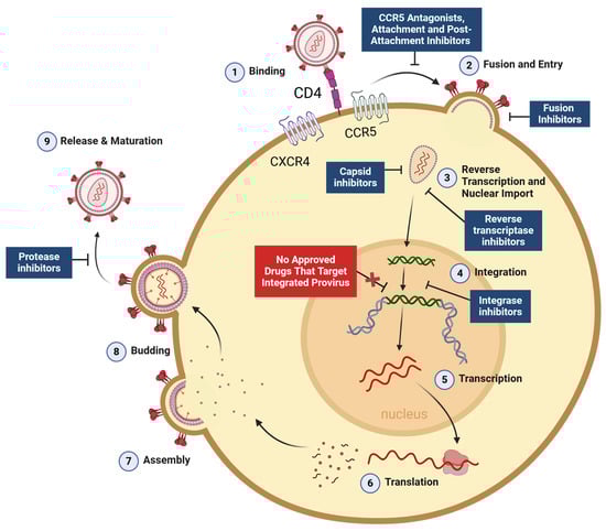 Human immunodeficiency virus (HIV) remains a leading global health concern. In 2022, 39 million people across the world were living with HIV, 1.3 million people were newly infected that year, and over 40 million people had died of acquired immunodeficiency syndrome (AIDS) since the start of the HIV epidemic [1]. Combination antiretroviral therapy (ART) medications are used to prevent HIV acquisition and treat HIV infection [2]. These medications target different steps of the HIV life cycle to prevent virus replication. An impressive array of different antiretroviral drug classes have advanced to clinical use for HIV treatment, including pre-attachment, post-attachment, and fusion inhibitors, capsid inhibitors, non-nucleoside reverse-transcriptase inhibitors, nucleoside and nucleotide reverse-transcriptase inhibitors, integrase strand transfer inhibitors, and HIV protease inhibitors (Figure 1). During optimal treatment, several different antiretroviral drugs (typically three) belonging to at least two different classes are provided in combination to effectively suppress virus replication and reduce the probability of drug-resistant virus emerging in the treated individual [2]. Ideally, this treatment will reduce plasma viral loads to undetectable levels and prevent HIV infection from advancing to AIDS. ART is therefore critical in extending the lifespan of people with HIV (PWH) and has saved millions of lives. However, ART is not a cure for HIV infection. Though it successfully inhibits the replicating virus, ART is unable to target stable reservoirs of HIV, including within latently infected CD4+ T cells [3,4,5,6], which persist in the host despite long-term ART.