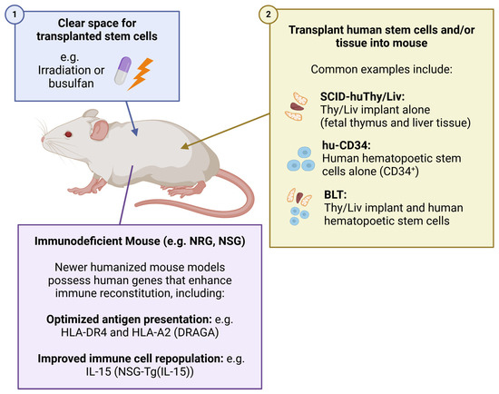While these models allow multilineage immune reconstitutions with different human immune cell lineages, they do have limitations [107], including reduced cell numbers in certain immune lineages and adaptive immune responses that are not as robust as those occurring in humans. This is being addressed with further advances in recipient mouse strains, which are engineered to express human cytokines, chemokines, or leukocyte antigens (HLAs) to facilitate the differentiation of specific immune-cell lineages, or support the production of adaptive T cell and antibody responses (Figure 3).