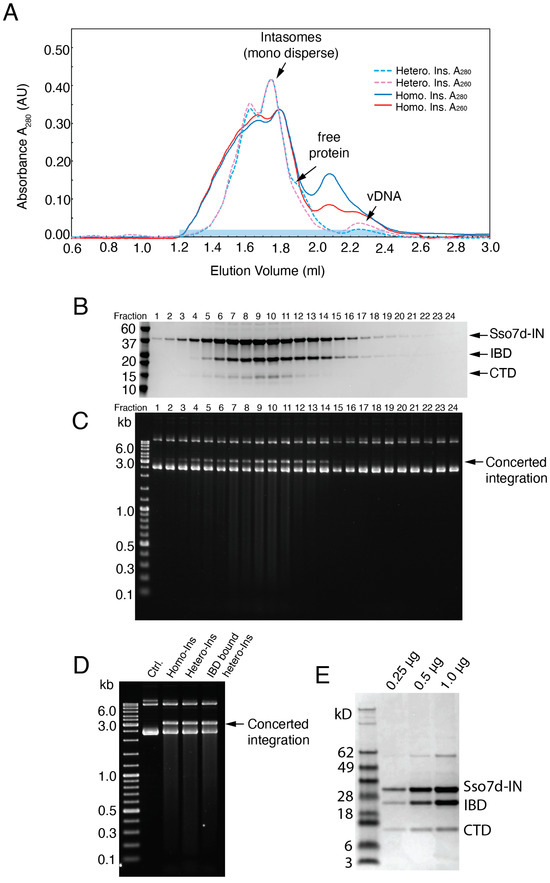 Heterointasomes were assembled by mixing full-length Sso7d-IN, His-tagged CTD, and vDNA, essentially as depicted in Figure 1C. Previous lentiviral intasome studies have leveraged the IN host cofactor lens epithelium-derived growth factor (LEDGF) [6,8,9,10,11,17]. In addition to full-length LEDGF, the P5 peptide derived from its AT-hook region as well as its IN-binding domain (IBD) have facilitated intasome assembly and solubility. We too used LEDGF-IBD (residues 307–460) to improve intasome solubility. Following assembly, the intasomes were crudely purified by a HisTrap Ni column followed by a gel filtration column to remove unreacted vDNA and proteins. The hetero-CSCs were eluted as a major peak on a Superose 6 column (Figure 3A). SDS-PAGE analysis of the elution fractions confirmed that the CTD as well as the IBD were indeed incorporated into the intasomes, which eluted from 1.4 mL to 1.9 mL (Figure 3B). The purified intasomes were competent for concerted integration activity (Figure 3C). Notably, intasomes assembled in the presence of the IBD and CTD were as active as complexes assembled with just the added IBD or with Sso7d-IN without added protein cofactors (Figure 3D). Semi-quantitative analysis of the hetero-CSC stoichiometry suggested that the protein ratio of full-length IN:IBD:CTD was roughly 1:1:0.3 (Figure 3E).