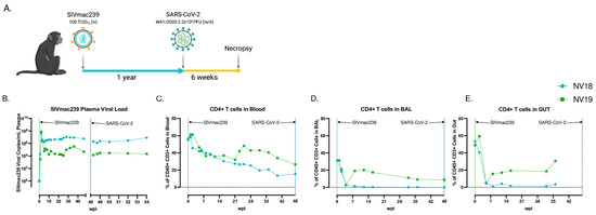 (A) Overall study design. Two female pigtail macaques (PTMs, NV18 & NV19) were inoculated with SIVmac239, followed by SARS-CoV-2 (WA1/2020) challenge approximately one year later. (B) Quantification of SIVmac239 RNA levels in plasma over time (quantitative RT PCR). CD4+ T-cell kinetics following SIVmac239 infection in blood (C), bronchoalveolar lavage (BAL) (D), and gut (E).