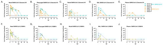 SARS-CoV-2 viral dynamics. Comparison of genomic (A–E) and subgenomic (SGM, F–J) SARS-CoV-2 mRNA levels in mucosal swabs (A–C,F–H), BAL supernatant (D,I) and plasma (E,J) in coinfected animals (blue) and a previously published cohort of SIV-naïve PTMs (orange).