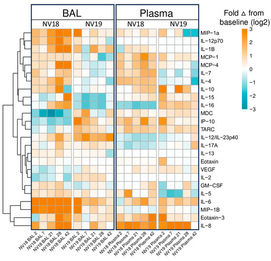 To measure concentrations of various chemokine and cytokine protein targets, three V-plex MSD Multi-Spot Assay System kits were utilized: Chemokine Panel 1 (Eotaxin, MIP-1β, Eotaxin-3, TARC, IP-10, MIP-1α, IL-8, MCP-1, MDC, and MCP-4), Cytokine Panel 1 (GM-CSF, IL-1α, IL-5, IL-7, IL-12/IL-23p40, IL-15, IL-16, IL-17A, TNF-β, and VEGF-A), and Proinflammatory Panel 1 (IFN-γ, IL-1β, IL-2, IL-4, IL-6, IL-8, IL-10, IL-12p70, IL-13, and TNF-α) (Meso Scale Diagnostics, USA). Protein targets were measured in BAL supernatant (BAL SUP) and EDTA plasma following the manufacturer’s instructions, with an extended incubation time of overnight at 4 °C to enhance sensitivity. Plasma samples were diluted 4-fold (Chemokine Panel 1) or 2-fold (Cytokine Panel 1 and Proinflammatory Panel 1) in the diluent provided in each kit. The plates were washed three times before prepared samples and calibrator standards were added. The plates were then sealed and incubated on a shaker at room temperature for two hours. Plates were immediately transferred to 4 °C conditions for overnight storage. The following day, plates underwent three washes before the addition of detection antibody cocktails. Plates were then sealed and incubated on a shaker for two hours at room temperature. Following three final washes, MSD Read Buffer T was added to the plates, which were immediately read using a MESO QuickPlex SQ 120MM instrument (Meso Scale Diagnostics, Rockville, MD, USA). The concentration of each analyte was determined based on the standard curve plotted between the known concentrations of calibrators and their respective signals. The Pheatmap package in R was used to generate the heatmap depicting log2 fold changes in chemokine and cytokine expression normalized to baseline (pre-SARS-CoV-2 inoculation).
