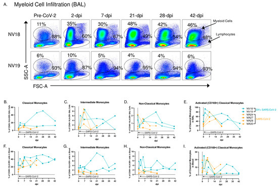 Monocyte/macrophage kinetics in BAL and blood following SARS-CoV-2 infection of SIV+ and SIV-naïve PTMs. (A) Representative flow cytometry dot plots of pulmonary-infiltrating myeloid cells and lymphocytes in the lungs of two SIV+ PTMs before and 2, 7, 21, 28, and 42 days after SARS-CoV-2 exposure. Gated on time>live>single cells>CD45+>SSC-A vs FSC-A. (B–I). Frequencies of classical (CD45+, HLA-DR+, CD14+, CD16−) (B,F) intermediate (CD45+, HLA-DR+, CD14+, CD16+) (C,G), and non-classical monocytes (CD45+, HLA-DR+, CD14−, CD16+) (D,H) in BAL (B–D) and blood (F–H) before and after SARS-CoV-2 infection. Day 0 = day of SARS-CoV-2 infection. (E–I) activated classical monocytes (CD169+) in BAL and blood. (B–I) SIVmac239/SARS-CoV-2-infected PTMs (blue), and SARS-CoV-2-only-infected PTMs (orange).